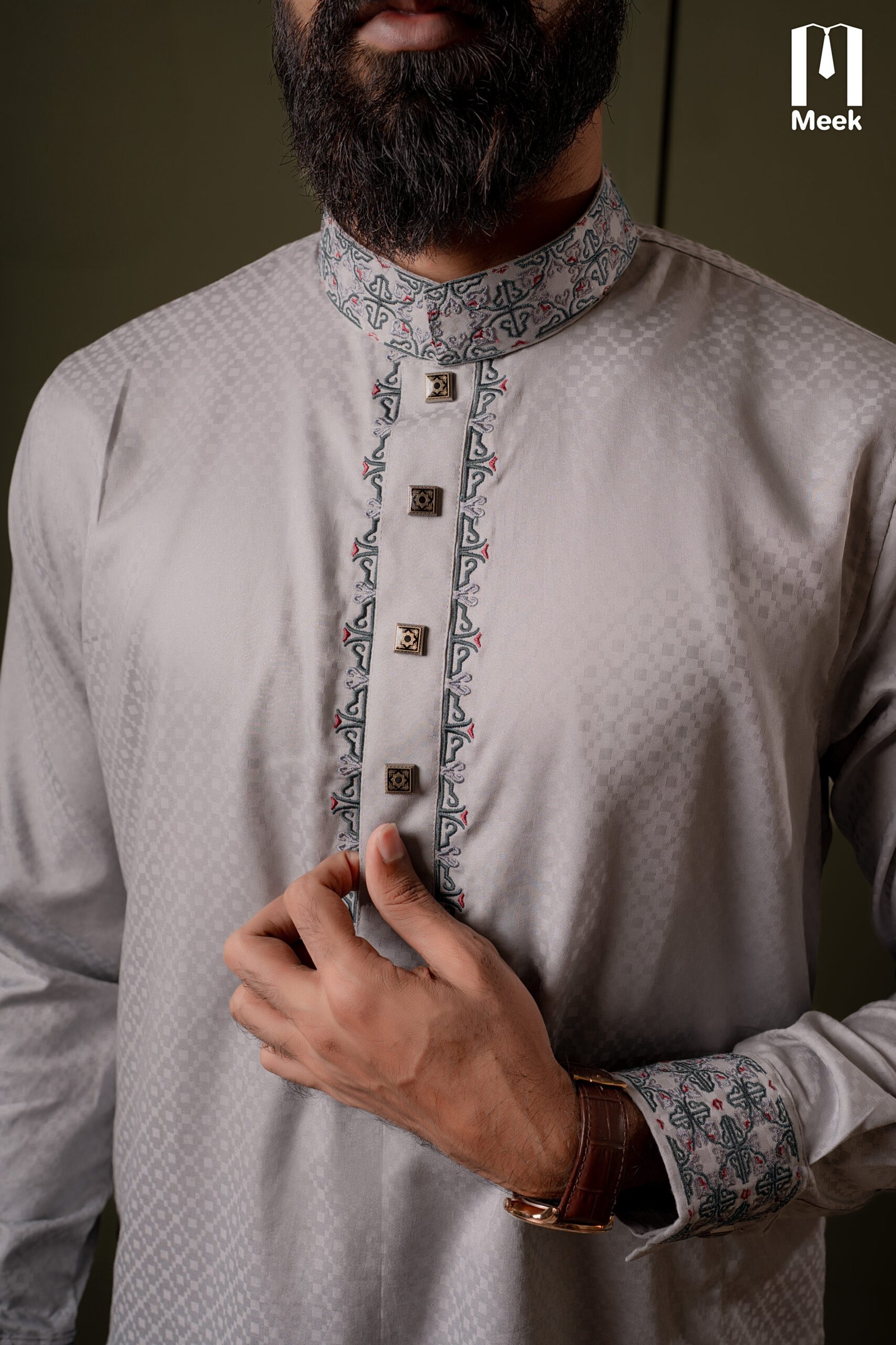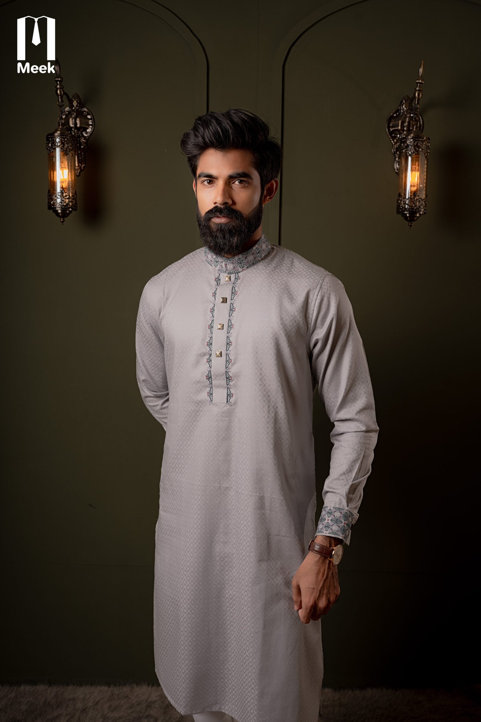 The Panjabi features a subtle self-textured pattern with intricate embroidered detailing along the placket and collar, adding a touch of sophistication. The cuffs are accented with matching embroidery for a refined finish. Its modern yet traditional design makes it a versatile addition to your wardrobe.